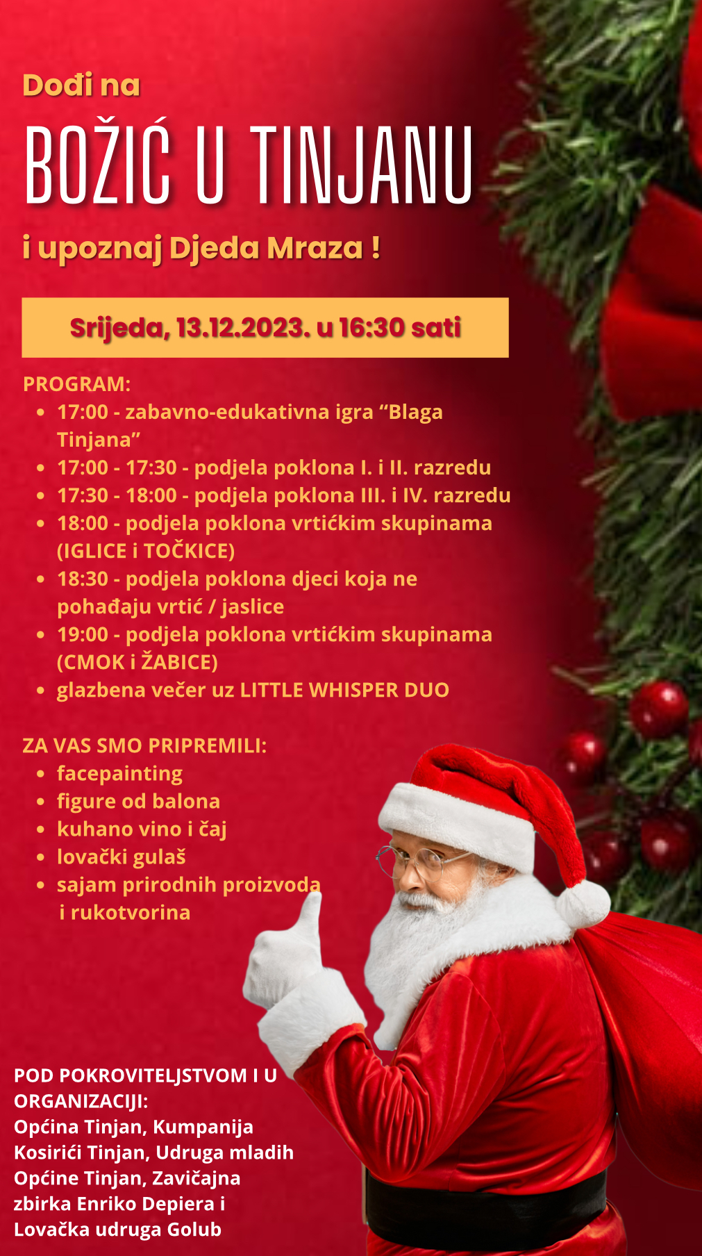 Želite se fantastično zabaviti u blagdansko vrijeme i upoznati Djeda Mraza? Ništa lakše, samo trebate doći na Božić u Tinjanu u srijedu 13. prosinca u 16:30 sati na plato ispred zgrade Općine i u Dom mladih.