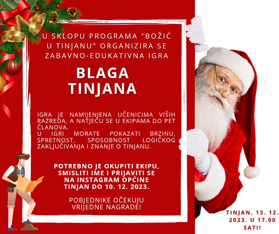 Već u 17 sati očekuje vas zabavno-edukativna igra "Blaga Tinjana" namijenjena učenicima viših razreda koji će se natjecati u ekipama s najviše pet članova. Cilj ove zanimljive igre je pokazati brzinu, spretnost, sposobnost logičkog zaključivanja i naravno, znanje o Tinjanu, pa sve koji bi sudjelovali pozivamo da oforme ekipu, daju joj ime te se potom prijave na Instagram profil Općine Tinjan najkasnije do 10. prosinca. Ne zaboravite, pobjednike očekuju vrijedne nagrade!