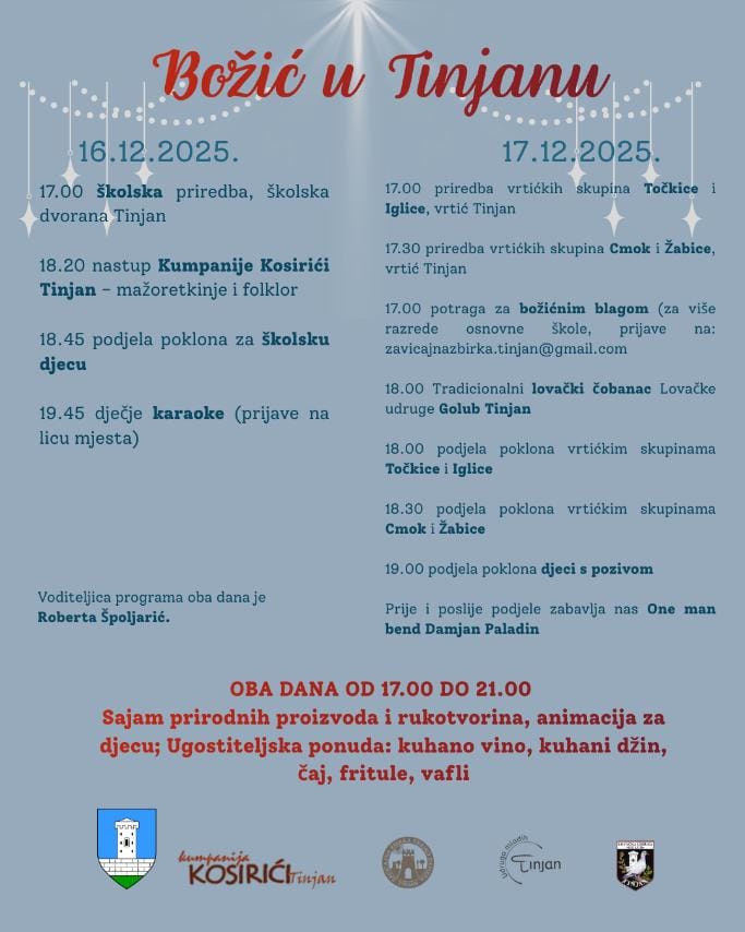 Općina Tinjan u suradnji s Kumpanijom Kosirići Tinjan, Osnovnom školom i vrtićem Tinjan te brojnim udrugama i volonterima organizira dvodnevni božićni program „Božić u Tinjanu“, koji će se održati 16. i 17. prosinca 2025. godine. Svi mali i veliki posjetitelji pozvani su provesti predblagdanske dane u zajedničkom druženju, glazbi, dječjem osmijehu i mirisima domaćih delicija.