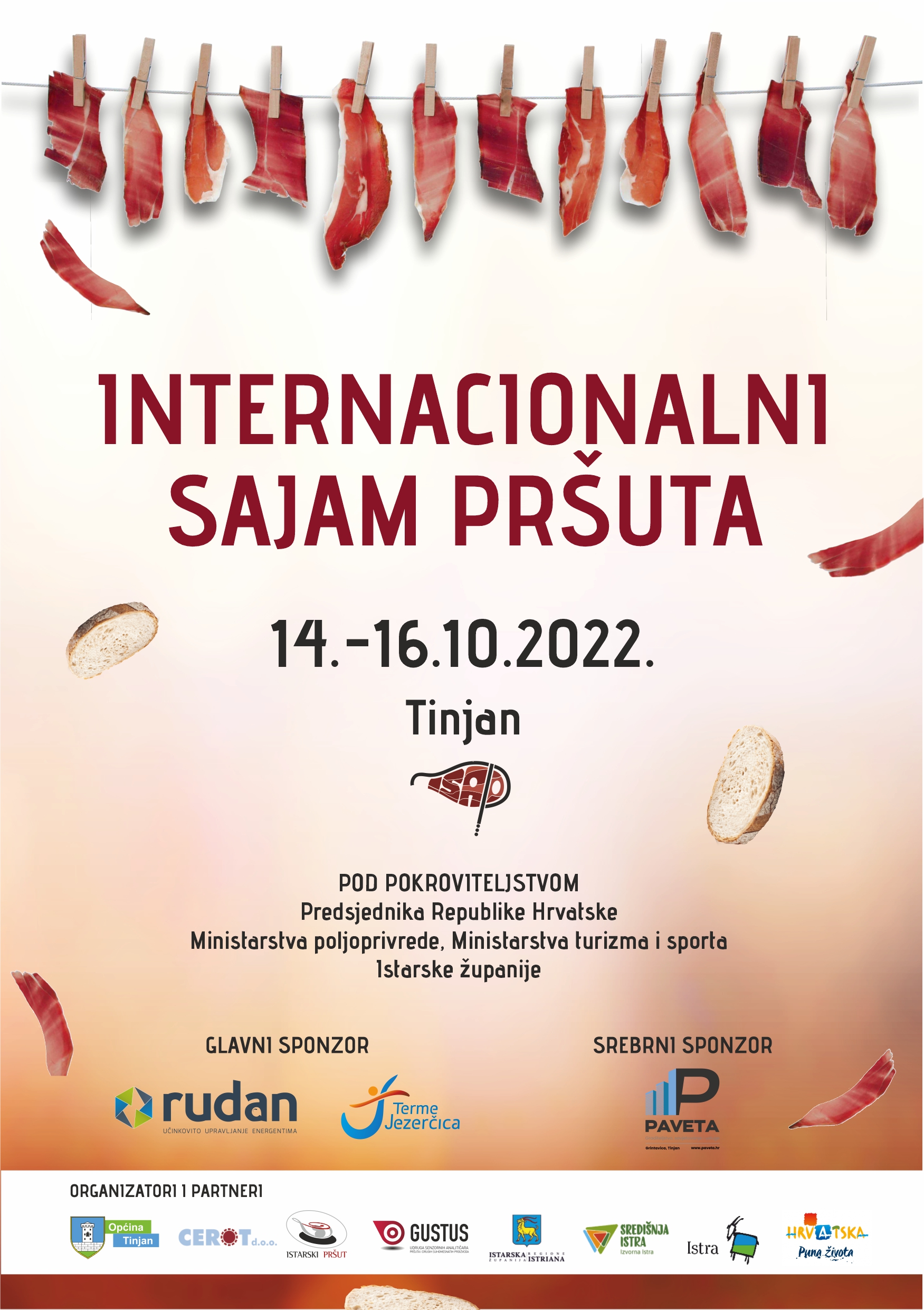 Četrnaesto izdanje Internacionalnog sajma pršuta nam je pred vratima: od petka 14. listopada pa do nedjelje 16. listopada Tinjan će biti domaćin najveće fešte posvećene pršutu u ovom dijelu Europe. Nakon dvije dugačke godine prisilne pauze zbog korone, ISAP se vraća u najboljem svjetlu, predstavljajući najbolje pršute iz Istre, iz drugih hrvatskih regija i iz drugih pršutarskih zemalja Mediterana i Srednje Europe.