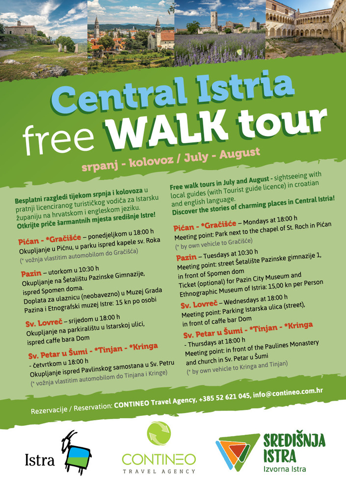 TZ središnje Istre tijekom mjeseca srpnja i kolovoza organizirat će besplatne obilaske Pićna i Gračišća, Pazina, Svetog Lovreča te Svetog Petra u Šumi, Tinjana i Kringe i njihovih znamenitosti.