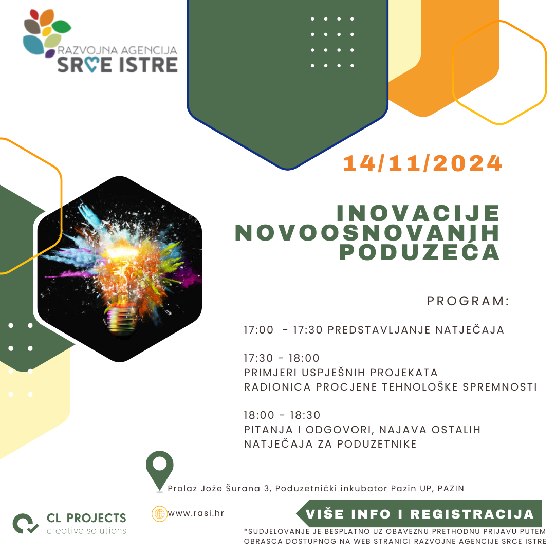 Pozivamo Vas da nam se 14.11. u 17,00 sati pridružite u Poduzetničkom inkubatoru Pazin UP na predstavljanju 2 natječaja: