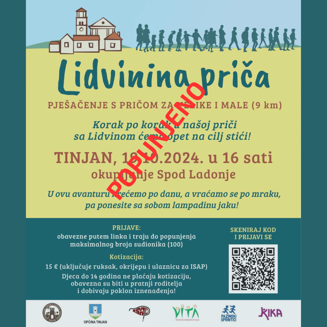 Mjesta su sva popunjena za "Lidvinina priča", rekreativno pješačenje za velike i male, hvala svima i vidimo se u subotu 19.10.2024. u 16 sati spod ladonja u Tinjanu u sklopu Internacionalnog sajma pršuta.