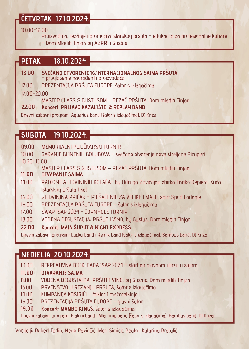 Istog dana, nakon otvorenja sajma, u 17 sati će u šatoru s izlagačima biti upriličena prezentacija europskih pršuta, dok će se od 17 do 20 sati u Domu mladih Tinjan održati odlična edukativna radionica "Masterclass s Gustusom – rezač pršuta" u organizaciji Udruge senzornih analitičara Gustus. Napomenimo i da će dan ranije, 17. listopada od 10 do 16 sati, profesionalni kuhari moći prisustvovati edukaciji namijenjenoj upravo njima pod nazivom "Proizvodnja, rezanje i promocija istarskog pršuta". Organiziraju je AZRRI i Gustus u Domu mladih Tinjan. Tijekom cijelog petka nakon otvorenja trajat će dnevni zabavni program kroz koji će posjetitelje u šatoru s izlagačima zabavljati Aquarius bend te u party zoni DJ Kriza. Od 22 sata počinje odličan koncert Prljavog kazališta i Replay banda.