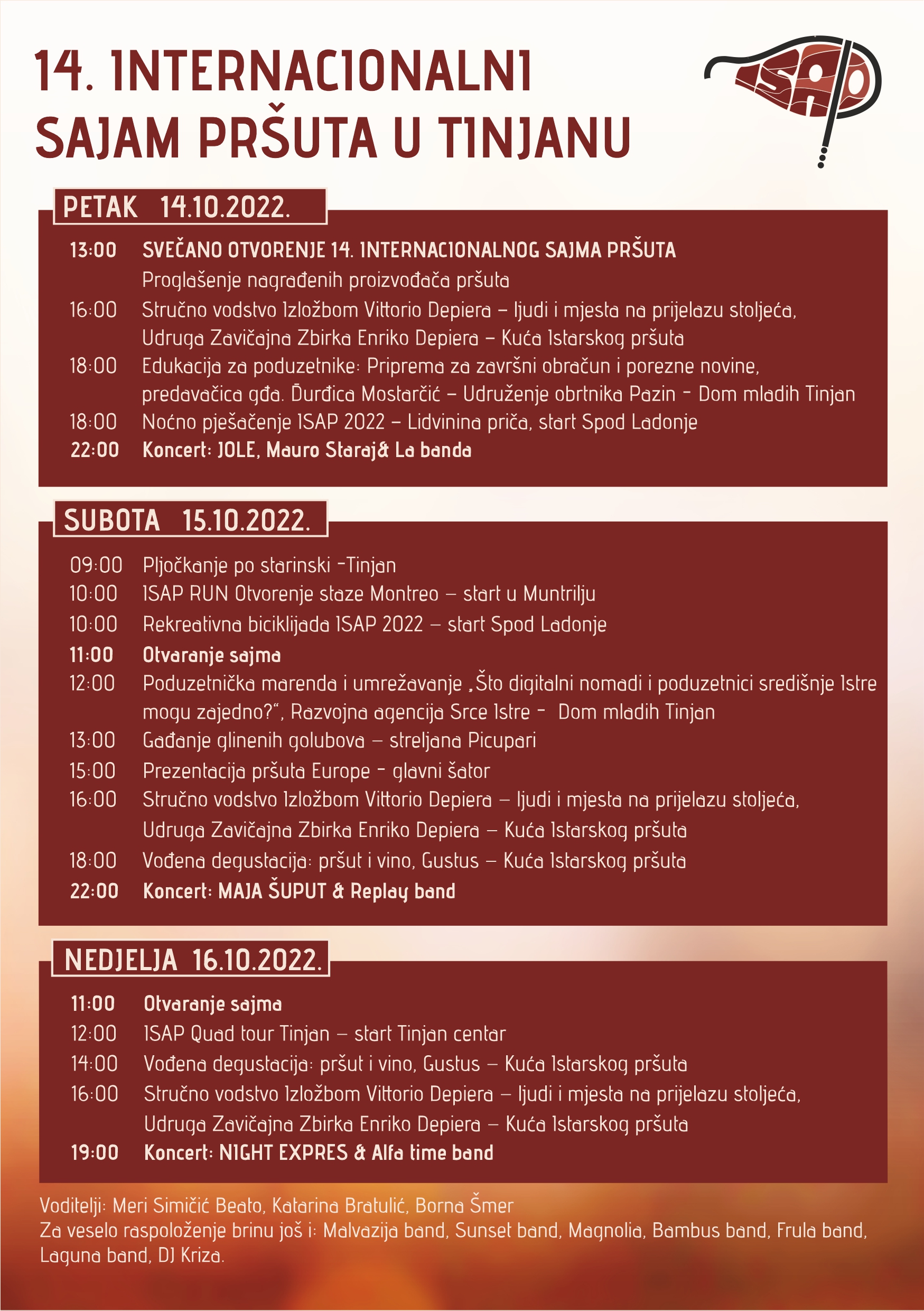 Četrnaesto izdanje Internacionalnog sajma pršuta nam je pred vratima: od petka 14. listopada pa do nedjelje 16. listopada Tinjan će biti domaćin najveće fešte posvećene pršutu u ovom dijelu Europe. Nakon dvije dugačke godine prisilne pauze zbog korone, ISAP se vraća u najboljem svjetlu, predstavljajući najbolje pršute iz Istre, iz drugih hrvatskih regija i iz drugih pršutarskih zemalja Mediterana i Srednje Europe.